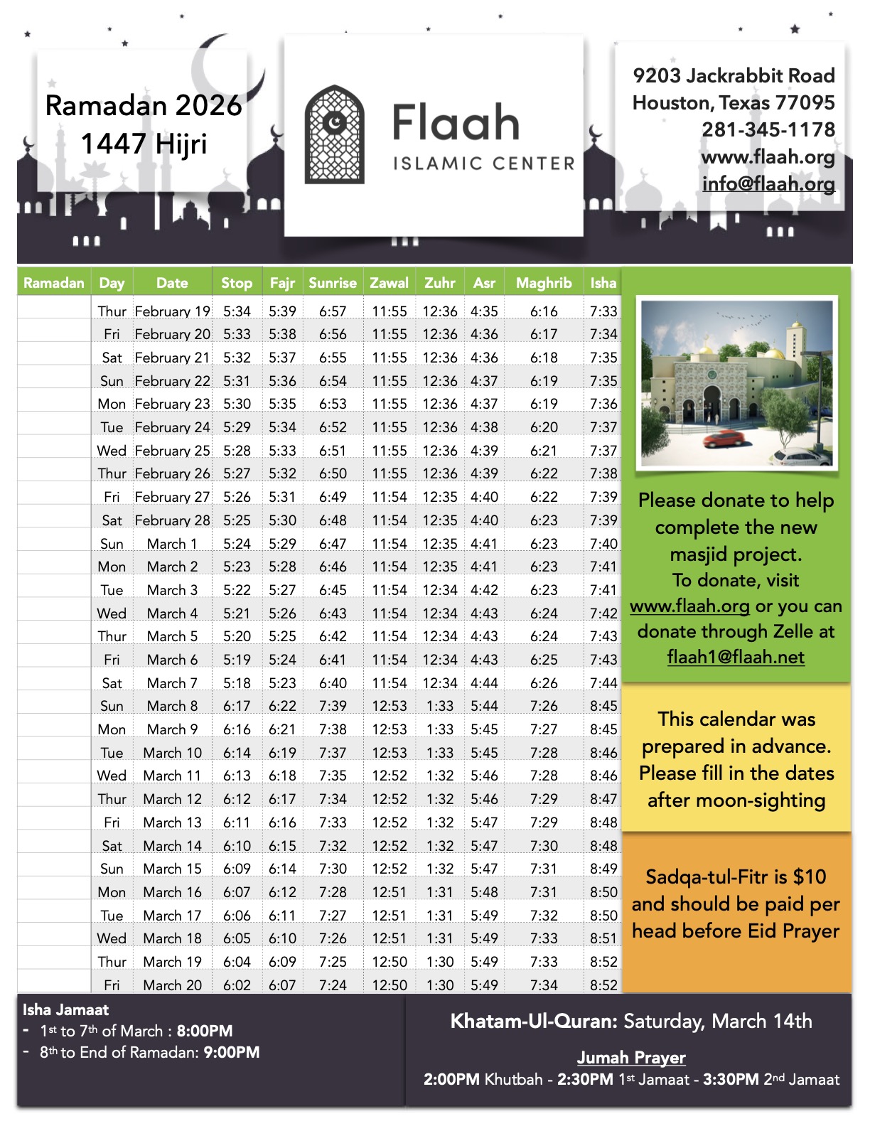 Assalamoalaikum, we were not able to sight the moon and did not receive proper evidence of a moon sighting. Therefore, Ramadan will start on Thursday, February 19th. Taraweeh will start Wednesday, February 18th after Isha Jamaat at 8pm. Below is the link for the Ramadan 2026 calendar.